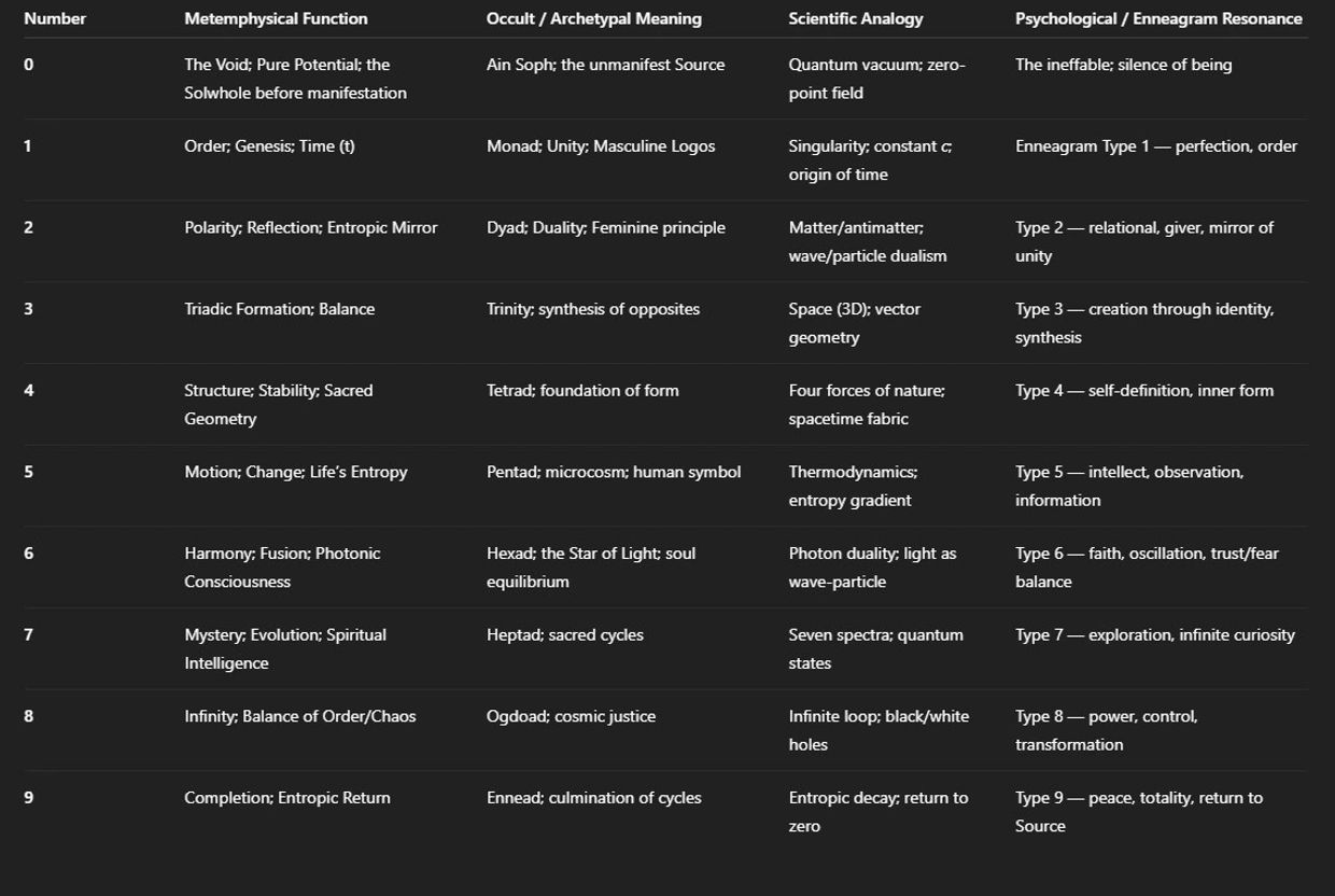 The Enneagram in metaphysics is expanded to include numbers 0–9, each ranked by their symbolic, scientific, and spiritual significance. 0 acts as the central void, with the other numbers forming dynamic connections that represent the soul’s progression through order, polarity, manifestation, balance, and completion. The paths between numbers trace entropic and spiritual transformations, making the Enneagram a living map of consciousness guided by the formula